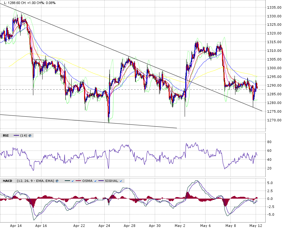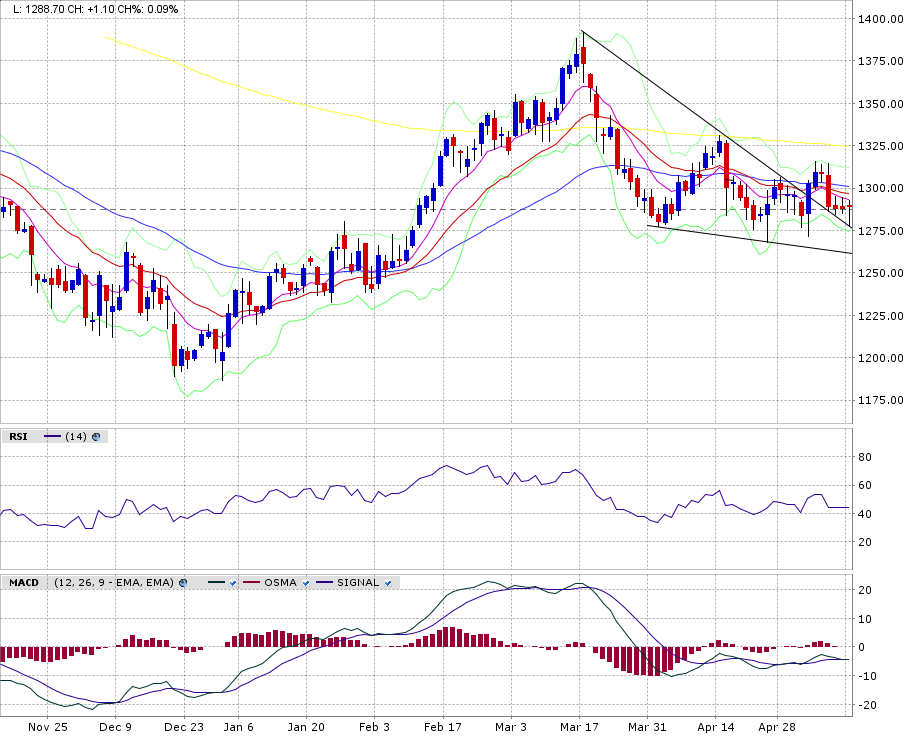 Die 3. Möglichkeit wäre ein Überschiessen nach oben. Was mich aber stark zweifeln lassen würde, ob meine Vermutung einer Topbildung hier und jetzt Gültigkeit hat. Natürlich ist eine Wette auf ein Top sehr riskant. Insbesondere, da die Gründe für die Rally, nämlich das endlose Drucken von Geld, das eins zu eins in die Finanzmärkte fliesst, noch immer vorhanden sind. Ich meine aber, dass die Zeit reif ist, erstens saisonal, zweitens übergeordenet nach 5 Jahren Bullenmarkt, und drittens aufgrund müde aussehender Charts (mehrfach divergierend) im grösseren Rahmen (daily, weekly). Auf kürzerer Frist (60 Min) ist noch kein Anzeichen einer Umkehr zu erkennen, an Widerstand zwar, aber mit guter Chance für höhere Preise imho... weshalb ich noch eine Spur höher mit Top Freitag oder Montag favorisieren würde.Gold: keine Veränderung. Solange unter 1300$ ist ein Test im unteren Bereich zu erwarten. Wedge im Tageschart ist gut ersichtlich. Ich vermute, ein Goldanstieg passiert nicht, solange Aktien höher tendieren.