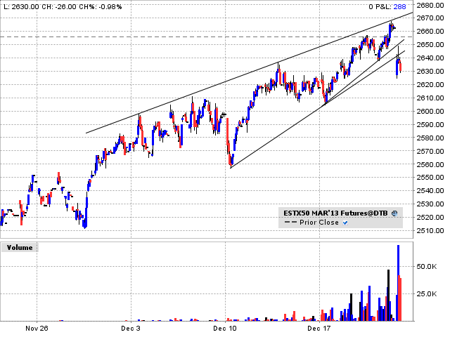 Fiscal Cliff ist ein Stückchen näher gekommen. Dass die Futures absackten, obwohl nicht zu erwarten war, dass vor Weihnachten ein Lösung kommen würde, zeigt die Nervosität der Märkte. Es ist alles möglich und das Gegenteil auch. Ende Jahr gehen oft Trends zu Ende. Dies muss natürlich nicht so sein, doch erhöhte Vorischt ist geboten. Ich erwarte zumindest für Gold eine Wende und wenn Gold dreht, warum sollten nicht auch Aktien, Yen und weiss ich nicht was auch drehen? Auf Fundamentales kann man sich kaum abstützen (Gold runter in der aktuellen Lage!!!!).
