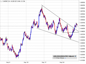 Chart 1: AUD/USD (Euro sieht ähnlich aus) Ausbruchnach oben im 60 Min. Ideal wäre hier ein Rücksetzer auf ca. 1.04. Dort idealer Kaufpunkt (nicht nur für den AUD/USD, auch Goldaktien könnten dort interessant sein...
