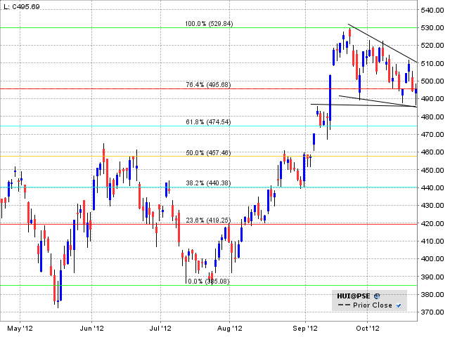 Was optimistisch stimmt, ist die erneute relative Stärke von Goldaktien. Auch wenn der Aktienmarkt heute/morgen verlieren sollte, auch wenn Gold die 1700 erreicht oder gar unterbietet: Gold- und Silberaktien dürften in ihren bullischen Konsolidierungsformationen bleiben. Rücksetzer bis in die Regionen vom letzten Freitag, oder gar nicht mal ganz, (beim HUI so 490) wären somit Kaufkurse. Mit ein bisschen Glück gelingt sogar ein Ausbruch aus der Kosolidierung nach oben bereits heute, wobei ich hiervon (noch) nicht überzeugt bin.