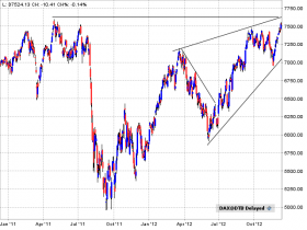 • Heute dürfte was los sein. Es ist der 12.12.12...... und Bernanke hat was zu sagen. In welche Richtung? Ich tendiere nach wie vor gegen oben, weshalb ich ein paar Longs habe (mit sehr knappem Stop), die gegen oben ausbrechen könnten bzw. ausgebrochen sind und noch Raum nach oben haben. Meine Zuversicht ist aber nicht sehr hoch, da wir das Minimalziel bereits erreicht haben beim SPX (siehe vorheriges Posting), ich deshalb auch den Nadaq Future short bin zur Absicherung.
