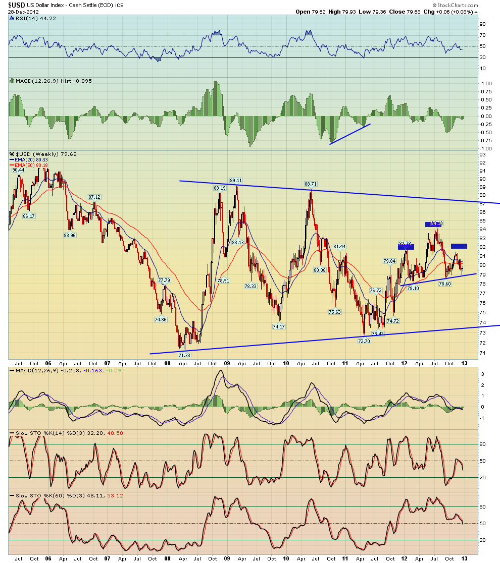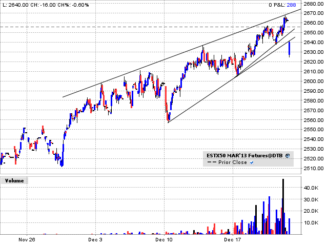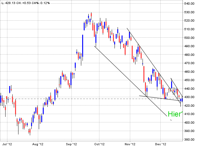 Fiscal Cliff ist ein Stückchen näher gekommen. Dass die Futures absackten, obwohl nicht zu erwarten war, dass vor Weihnachten ein Lösung kommen würde, zeigt die Nervosität der Märkte. Es ist alles möglich und das Gegenteil auch. Ende Jahr gehen oft Trends zu Ende. Dies muss natürlich nicht so sein, doch erhöhte Vorischt ist geboten. Ich erwarte zumindest für Gold eine Wende und wenn Gold dreht, warum sollten nicht auch Aktien, Yen und weiss ich nicht was auch drehen? Auf Fundamentales kann man sich kaum abstützen (Gold runter in der aktuellen Lage!!!!).