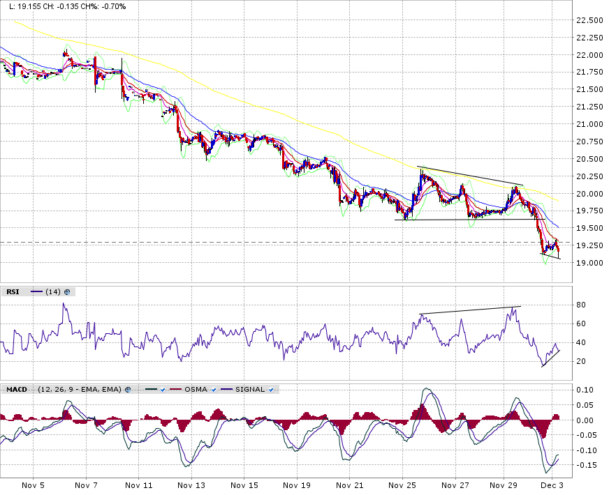 ...und schon wird es spannend... Unterer Kanal nicht mehr berührt, nun der Versuch nach oben. Aktuell 19.82$, MA und Abwärtstrendlinie hier als Widerstand. Bei über 20$ wäre ein höheres High drin.