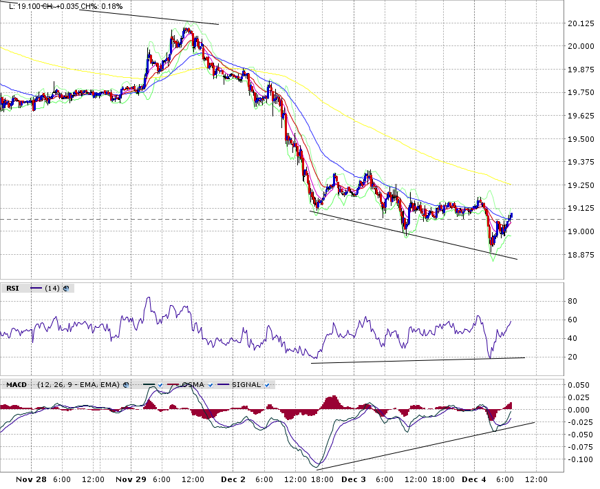 Gold / Silber tun sich schwer. Silber heute stärker als Gold. Trotz Divergenz im 60 Min.ist der Abwärtstrend noch immer intakt.