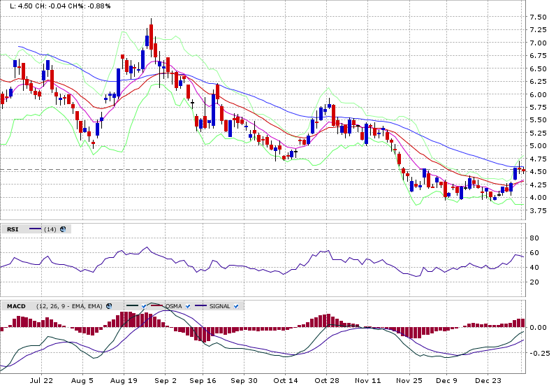 Ausbruch aus dem Abwärtstrend, und nun Konsolidierung, oberhalb des 9 und 20 MA. Teilweis kommt bereits der 50MA als Widerstand.