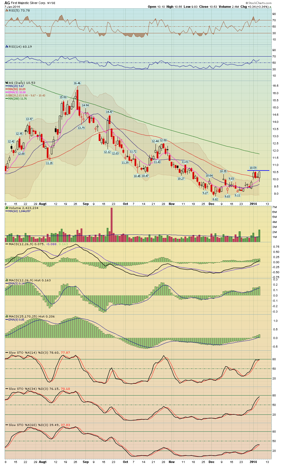 Noch 2 weitere Charts: AG mit tollem Tag, und Auch AUY sieht bullisch aus. So oder ähnlich sehen nun viele Gold- und Silberaktien aus. Sehr konstruktiv. Für einen Ausbruch nach oben müssen nun die EM's mitspielen.