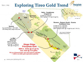 PR vom 11.10.:"The property-wide regional-scale exploration program has identified five new early stage geochemically anomalous zones hosted within favourable Tireo volcanic lithologies. The new target areas extend and are within two loosely recognized regional mineral prospect trends that bisect the contiguous Precipitate and Goldquest Mining Corp. landholdings....