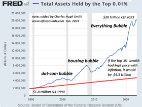 Aber alle Blasen knallen, und es gibt keine Tricks, um sowohl die Gier der Wenigen als auch die Bedürfnisse der Vielen zu finanzieren. Die oberen 0,01% besitzen fünfmal so viel wie die unteren 50%-170 Millionen Amerikaner. Das ist eine sehr hübsche Entropie, die als Stabilität verkleidet ist....