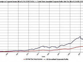 Die Divergenz profit / tax ist gut erklärbar. Dies ist das Ergebnis des Kompromisses von Demokraten und Republikaner. Die Demokraten wollen mehr ausgeben, die Republikaner weniger Steuern zahlen. Nun ist es einfach so, dass der immer grösser werdende Staatshaushalt ganz einfach mit gedruckten Dollars bezahlt wird.... und alle sind glücklich. Der Staat braucht doch keine Steuerdollars, wenn seine Lieblingstante, im aktuellen Fall Yellen, für alle Kosten aufkommt.