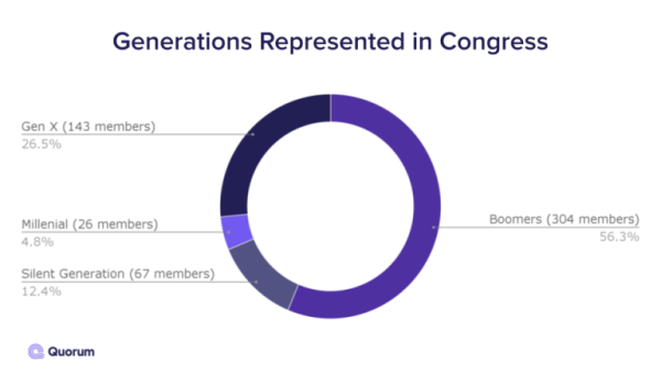 Die Silent Generation (1928-1945) stellt 12,4 % des Kongresses. Die überwiegende Mehrheit entfällt auf die Boomer-Generation (1946-1964), die 56,3 % des Kongresses stellt. Im Vergleich dazu macht die Boomer-Generation nur 23,7 % der US-Bevölkerung aus. Nancy Pelosi, die Dritte in der Reihe der Präsidentschaftskandidaten, ist bereits 82 Jahre alt. Sie wurde während des Zweiten Weltkriegs geboren und wuchs in einer völlig anderen Version von Amerika auf.