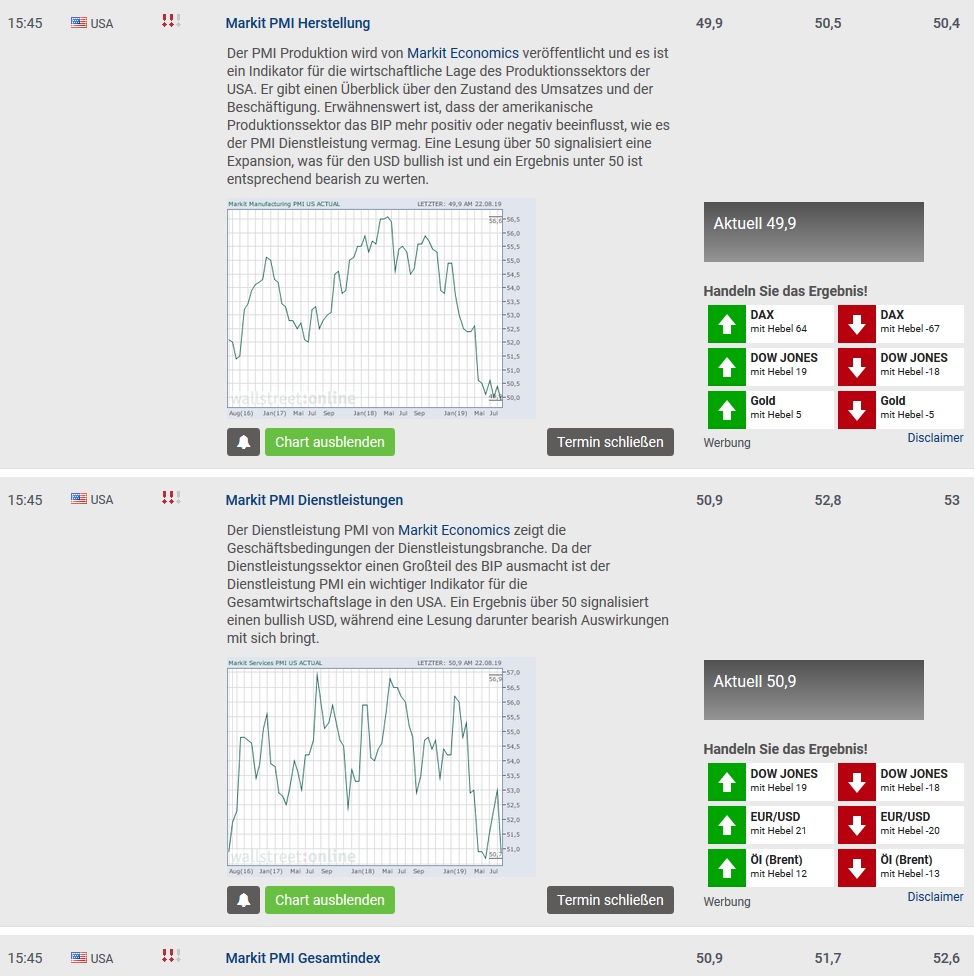 Beinahe noch symbolträchtiger ist der Befund, dass beide PMI-Markit-Indikatoren nicht nur schlechter ausgefallen sind als zuletzt und als erwartet, sondern dass auch erstmals der Markit PMI Herstellung (wenn auch nur knapp) unter 50 gefallen ist, was nicht nur eine Verlangsamung des Anstiegs der Produktion, sondern bereits eine Trendumkehr (Produktionsrückgang) indiziert: