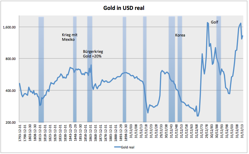 "Zur Zeit der meisten Kriege fiel der Goldpreis sogar. Nur während des Bürgerkrieges stieg Gold an. Die Inflation betrug in diesen Jahren um die 20%. Danach gab es jahrelange Deflation. Gold verlor überproportional stark."