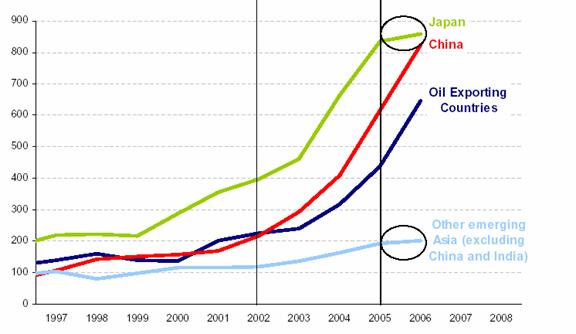Die «Flucht» aus dem Dollar lässt sich nicht alleine bei wichtigen Ölstaaten beobachten, sondern auch bei der Volksrepublik China, die inzwischen – nach europäischer Zählweise – über Reserven von mehr als einer Billion US-Dollar verfügt. Um eine gravierende Umschichtung dieser entscheidenden Reserven doch noch zu verhindern, reisten Mitte Dezember US-Fed-Chef Ben Bernanke und US-Finanzminister Henry Paulson mit einer hochrangigen Delegation persönlich nach Peking. Doch die chinesische Führung liess die Delegation abblitzen und begründete ihren Beschluss wie folgt: