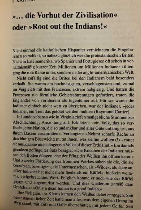 „Hitlers Konzept der Konzentrationslager verdankt sich in hohem Maße seinem Studium der englischen Sprache und der Geschichte der Vereinigten Staaten. Er bewunderte die Lager für die Buren in Südafrika und für die Indianer im Wilden Westen und lobte in seinem engeren Kreis oft die Wirksamkeit der Vernichtung der indigenen Bevölkerung Amerikas, der roten Wilden, die nicht gefangen und gezähmt werden konnten Hunger und in ungleichen Schlachten. „Adolf Hitler“ John Toland