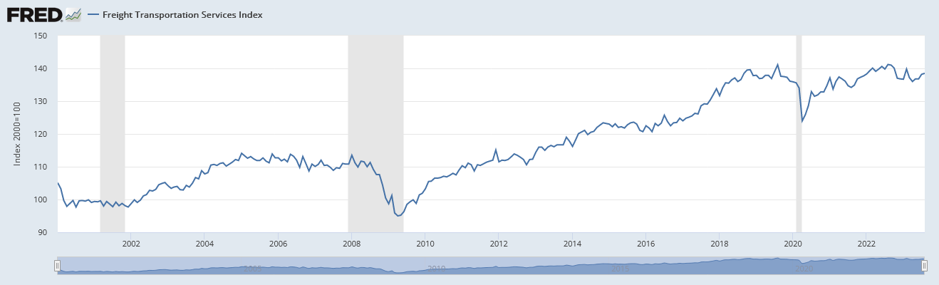 Ich gaube jetzt braut sich merkbar was zusammen. Das Szenario der progressiven Verschlechterung was ich für die USA sehe läuft voll nach Plan. Die Masseneinwanderung scheint wirtschaftlich nichts zu bewirken. Ein Amerikanischer Handwerker dem ich auf Youtube folge meint vor 3 Wochen sind seine Aufträge abrupt eingebrochen. Seine Auslastung ist von 150% auf 5% abgesackt seine Worte. Vorher hat sein Telefon ständig geklingelt jetzt vielleicht noch 3 Anrufe die Woche von Bestandskunden. Das gleiche habe ich von einem kanadischen Onlinehändler gehört der seit 2001 in die USA verkauft. Verkäufe sind absolut eingebrochen auf ein Niveau schlimmer als 2008/09. Ich habe noch diese Grafik gefunden. Sie zeigt das US Frachtaufkommen hat sich nie erholt und liegt deutlich unter Trend.