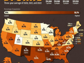 Diese Karte, die von Kayla Zhu von Visual Capitalist erstellt wurde, zeigt den Dreijahresdurchschnitt der Armutsquoten nach US-Bundesstaat von 2020 bis 2022.