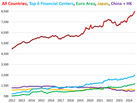 - Euroraum: $1,69 Billionen, +2,3% gegenüber dem Vormonat, +13,5% gegenüber dem Vorjahr (grün). Darin enthalten sind drei der oben genannten Finanzzentren (Belgien, Luxemburg und Irland).