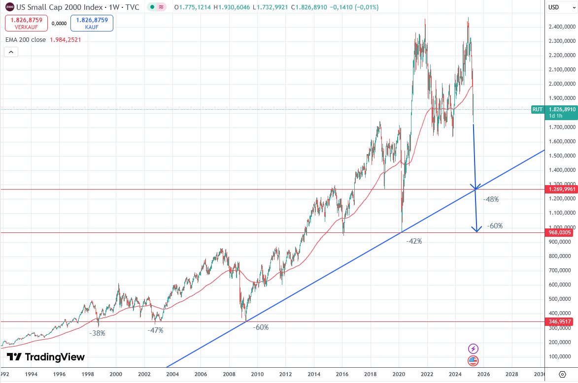 "Ich glaube, irgendeiner wird bankrott gehen. Alles ist stagnierend oder rückläufig, außer Gold.... Diese Art von Dingen endet normalerweise mit Zwangsliquidationen, und ich denke, sie haben letzte Woche begonnen, und wir sehen das heute Morgen. Es wird mehr Schuldenabbau geben, und die Fed ist wirklich nicht in der Lage ... die Zinssenkungen wieder aufzunehmen, weil ... die Leute nach Inflation Ausschau halten ... genau das Gegenteil von dem, was die Fed erhofft.... Die Fed kann wegen der Inflationssorgen nicht lockerer werden, und die Zollsorgen verstärken das natürlich noch. Vor weniger als drei Wochen ... habe ich Ihnen gesagt, dass ich eine Rezessionswahrscheinlichkeit von 60 % für möglich halte. Ich war der Meinung, dass dies nicht mit dem Konsens übereinstimmt, der meiner Meinung nach eher bei 30/35 % lag... Ich glaube, der Konsens liegt [jetzt] bei 50%... Ich kann nur meine 60% erhöhen.... Ich habe immer gesagt, dass der Markt lächerlich überbewertet ist.... Es gibt noch viel Spielraum für eine Normalisierung ... was auf der Grundlage des CAPE-Verhältnisses ein langer Weg nach unten ist.... Es wird chaotisch werden. Das sieht nach einem Deleveraging-Szenario aus, das sich verselbstständigen kann."