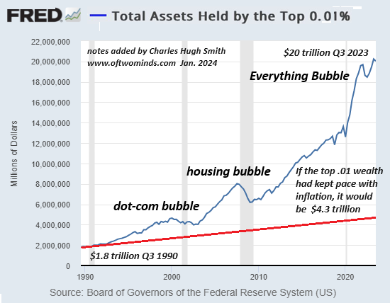 Aber alle Blasen knallen, und es gibt keine Tricks, um sowohl die Gier der Wenigen als auch die Bedürfnisse der Vielen zu finanzieren. Die oberen 0,01% besitzen fünfmal so viel wie die unteren 50%-170 Millionen Amerikaner. Das ist eine sehr hübsche Entropie, die als Stabilität verkleidet ist....