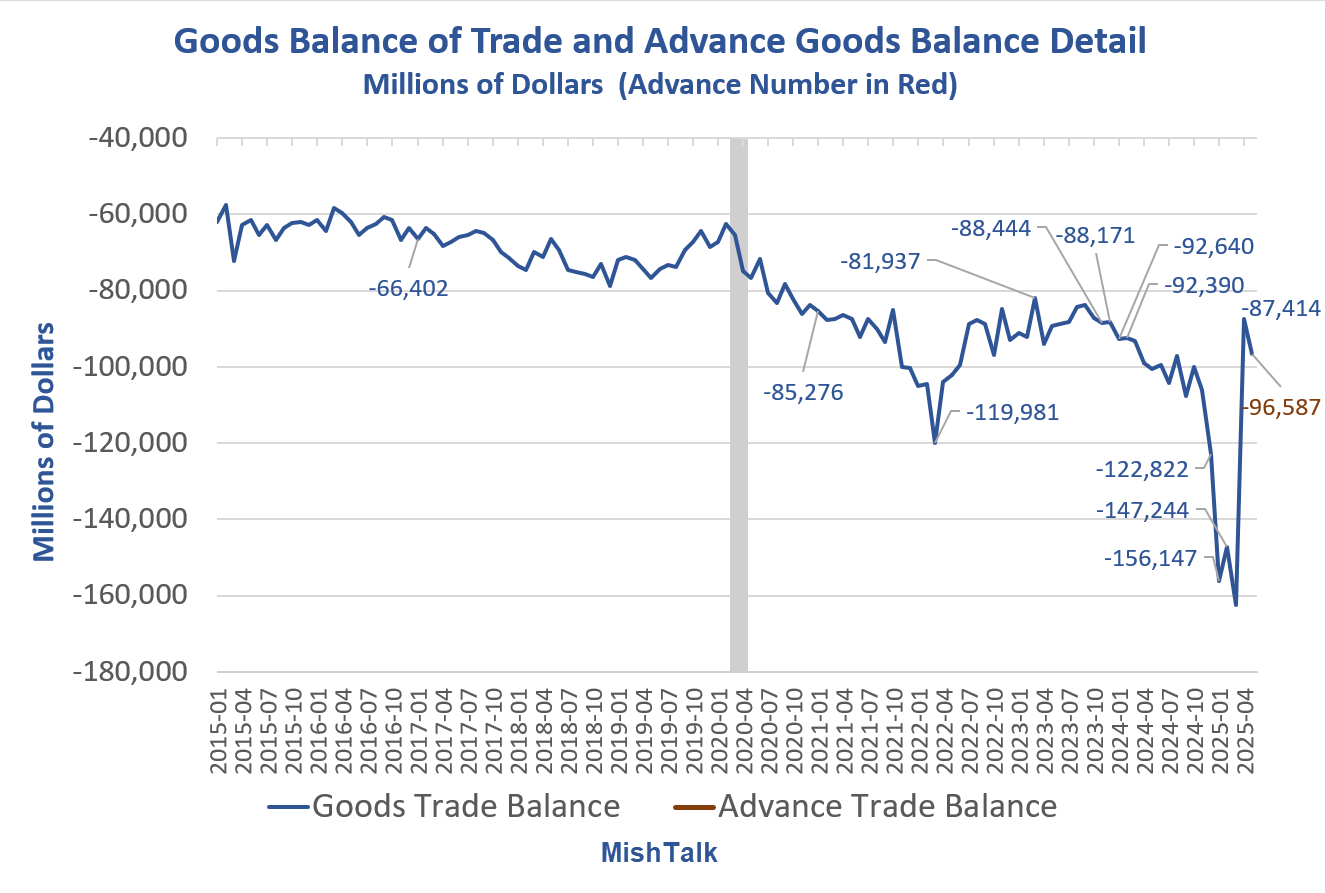 - The international trade deficit was $96.6 billion in May, up $9.6 billion from $87.0 billion in April.