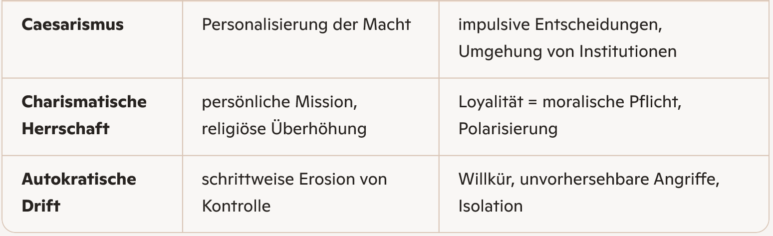 - Eine politische Führungsperson stützt sich direkt auf das Volk, nicht auf Institutionen.