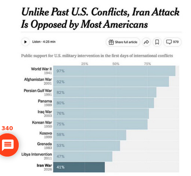 "Das obige Bild sagt Ihnen, warum Donald Trump in politischen Schwierigkeiten über seine Entscheidung ist, einen Krieg gegen den Iran zu beginnen. Frühere Präsidenten haben verstanden, dass Sie öffentliche Unterstützung sammeln müssen, bevor Sie US-Truppen und Flugzeuge nach Übersee schicken, um ein anderes Land anzugreifen, oder Sie riskieren politische Isolation und Schuldzuweisungen, wenn der Krieg schief geht. Und der Krieg mit dem Iran läuft schlecht für die USA, trotz der nächtlichen Cheer-Leading-Übertragung rund um die Uhr auf Fox News.