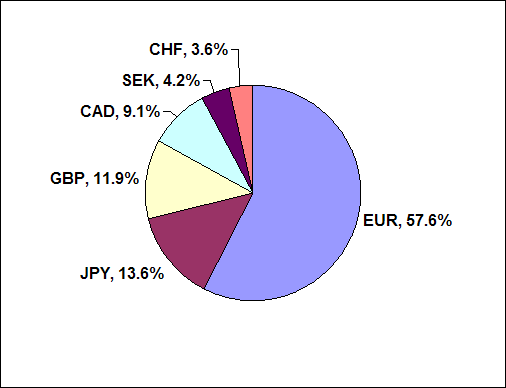 EUR= 0,64986 €/USD mit 57,6% am Index (sprich 0,64986 x 57,6% = 0,374)