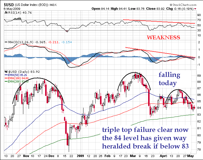 A better look at the USDollar breakdown in progress can be seen in the five-day chart. The defense of the 83.7 support level is the primary location of the battleground. It is trading at 83.75 at the moment of this written sentence. The battle is on. The USDollar is delivering a strong vote against the faulty green shoots claims motivated by ill-advised analysis, vested interest, if not survival. The USDollar is voting NO confidence to the sham bank sector claims of viability, when they are zombies with hollow cores. The USDollar is saying hard times are coming to the USEconomy, led by the manufacturing (cars in particular). Industry is ALWAYS the most important part of any economy, its fundamental value added sector, a chapter lost in the US economic history teachings in compromised universities across America. Wall Street hucksters need to read that chapter of economic history during detention after class, or better yet in prison cells......" ![]()