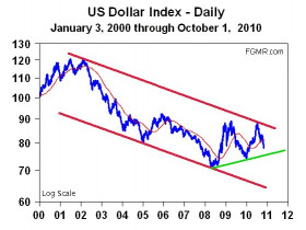 Zitat04. Oktober 2010 Der internationale Bankenverband Institute of International Finance (IIF) warnt vor einem Absturz des Dollar-Kurses, falls die amerikanische Zentralbank Federal Reserve ihre Geldpolitik weiter lockert. „Sollte die Federal Reserve sich auf den Kurs einer weiteren aggressiven quantitativen Lockerung einlassen, kann dies einen destabilisierenden Kollaps des Dollar hervorrufen“, heißt in einer am Montag veröffentlichten Studie des IIF zur globalen Wirtschaftslage.