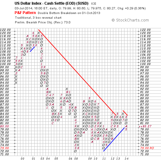 Pragmatisch fügt er auch einen P&F Chart für den USD an mit „Sell" Signal und weitere Charts an; Den Chart des USD habe ich akualisiert und nachgestellt.