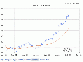 Es fließen zur Zeit enorme Summen in USD-Anlagen, weil alles andere dagegen schwach wirkt. Geld aus Russland, aus der Ukraine, aus Brasilien, aus Asien undsoweiterundsofort. Diesen einfachen Umstand können manche mit der globalen Ökonomie nicht vertraute Herrschaften, die noch vor wenigen Jahren im Camouflage-Outfit bei winzigen Minenexplorern, die sie mit Vorzugsaktien versorgt hatten (Moriarty) vorstelllig geworden sind, einfach nicht begreifen.