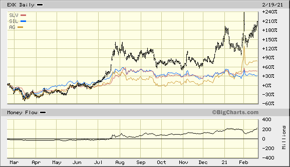 Der 5 Jahreschart mit der beeindruckenden 1 Jahresperformance. Der 2 Chart EXK vs Superstar AG,SIL und SLV, die etwas unter ihren Zwischenhochs notieren.