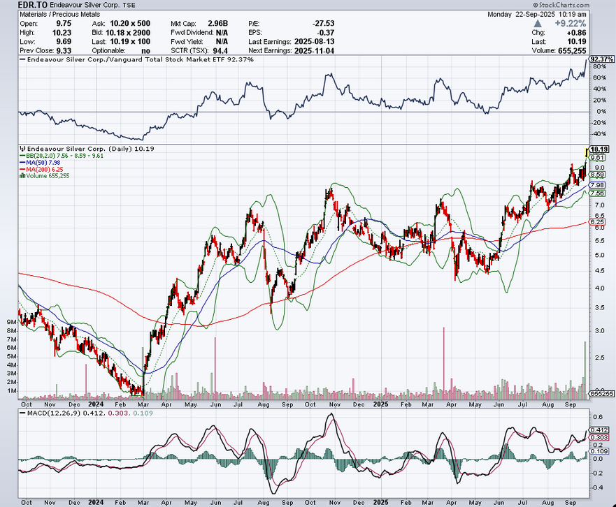 Globe and Mail berichtet in ihrer Ausgabe vom Donnerstag, 25. September, dass Analysten der National Bank Financial der Ansicht sind, dass das makroökonomische Umfeld die Edelmetallpreise aufgrund der anhaltenden politischen Unsicherheit, sinkender Realzinsen, anhaltender Inflation und der Tatsache, dass die Zentralbanken weiterhin Nettokäufer sind, stützt. David Leeder von Globe schreibt in seiner Kolumne „Eye On Equities”, dass die Analysten der National Bank Endeavour Silver weiterhin mit „Outperform” bewerten. Die Analysten erhöhten ihr Kursziel um 6 Dollar auf 16 Dollar. ?) Im Durchschnitt liegt das Kursziel der Analysten bei 9,23 Dollar. Am Mittwoch bekräftigte die Bank ihren optimistischen Ausblick für die Preise in den kommenden Monaten. Alex Terentiew, Analyst bei der National Bank, schreibt in einer Mitteilung: „In den nächsten Monaten wird Endeavour Silver eine bedeutende, das Unternehmen verändernde Transformation durchlaufen, da seine Flaggschiff-Mine Terronera hochgefahren wird und die kommerzielle Produktion aufnimmt (voraussichtlich in den kommenden Wochen) und die neu erworbene Mine Kolpa in das Unternehmen integriert wird. Diese beiden neuen Minen werden ein branchenführendes Wachstum erzielen, die Produktion mehr als verdoppeln und die Margen durch die Verbesserung der Vermögensqualität deutlich steigern.”