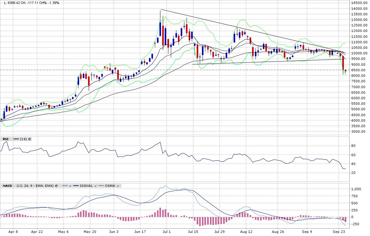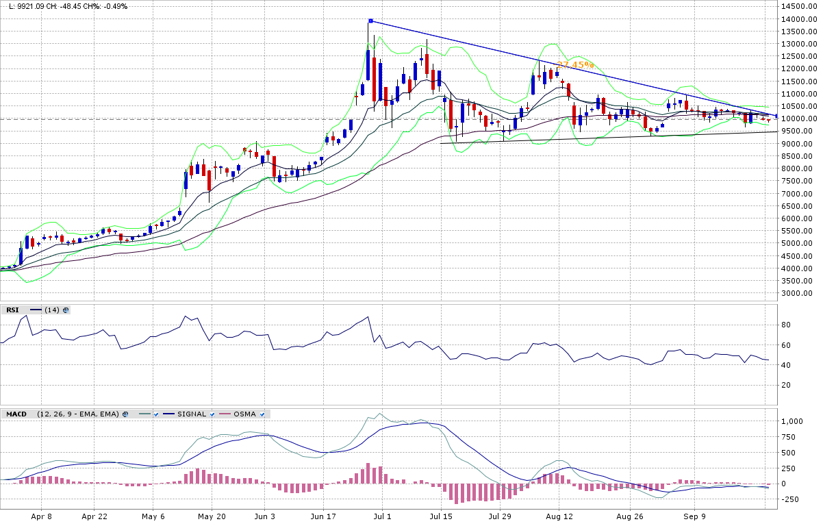 Das Top war mit deutlichen Divergenzen, der Abverkauf ab da stark, das sieht nicht so aus, als ob locker wieder neue Highs gemacht werden. Aktuell sind wir zwischen dem 50 und 61,8 % Retracement, typische Drehmomente. Der nach unten laufende 20 MA wurde berührt und bisher ist er Widerstand. Der 9 MA folgt gleich etwas höher.