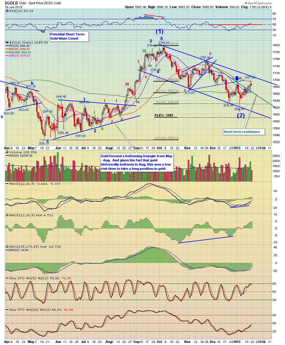 Beim Gold ist eine normale a-b-c-Korrektur erkennbar nach einer impulsiven Welle 1. Jetzt sollte somit Welle 2 nach unten (a-b-c) vollendet sein in einer sehr harmonischen und korrektiven Art und Weise und wir sind in den Anfängen einer Welle 3 nach oben. Die 3. Wellen sind im Normalfall die impulsiven und längsten!!! Man sieht aber auch auf dem Chart, dass die kritische Zone noch nicht überwunden ist (hast du ja auch bemerkt). Widerstände in Form von MA's und Downtrendlinie und sogar Bachtest Aufwärtstrendlinie sind voraus. Das sind harte Nüsse. Insofern ist ein Short hier verständlich, sofern er sofort umgedreht wird bei überwinden des Downtrendes....