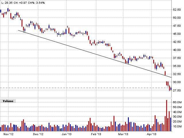 Gehen wir davon aus, dass die Erholung nun einsetzt. Manchmal gibt es nach einem Abverkauf eine V-förmige Erholung ohne Rücksetzer. Oft gibt es aber zuerst eine schnelle Erholung, dann wird der erste Boom nochmals abverkauft. Ziel dieser ersten Erholung ist im Minimum die 30, eher noch ins Gap rein zur Trendlinie, vielleicht kann auch bereits das Gap geschlossen werden. Ich sage mal, im Bereich 31.25 bis 32 $ wird es dann für die erste Euphorie wieder kritisch.