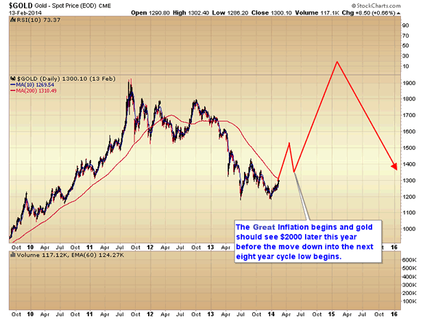 Erster Anlauf die nächsten 6 Monate bis 1950$, Korrektur (b aus B) in Richtung 1600 und eine C-Welle die als überschiessender Test von 15% oder auch im best case 30% etwa Mitte/Ende 2015 die 2500$ testen wird (runde Zahlen als Wendemarke sind bei Gold ja sehr beliebt). Danach ein schneller C-Wellen Crash in Richtung 1500$. Eine 5-jährige Korrektur des 10-jährigen Goldbullenmarkts entspricht ziemlich genau den normalen EW-Erwartungen. Überschießende Tests sind notwendig wenn eine dritte Welle eine Ausdehnung erfahren sollte. Diese Ausdehnung wird uns Ende des Jahrzehnts in Richtung 5000$ oder gar 10000$ bringen.