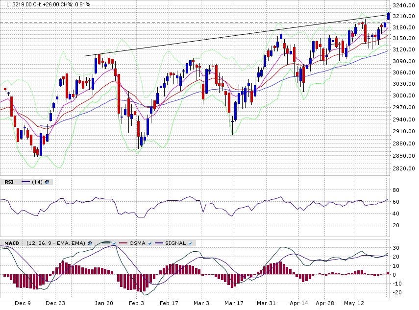 US-Indizes haben noch Platz gegen oben. Beim S%P 500 fehlt noch rund 1%, bis die Aufwärtstrendlinie von unten berührt wird. Dies müsste die Woche der Entscheidung werden. Noch immer ist Mai, demzufolge würde "sell in may and go away" noch immer gelten. Die Stärke von Aktien diesen Monat, insbesondere Eurostoxx, lässt mich aber doch fragen, ob der Einbruch doch noch kommt oder ob es den Zentralbankern weiterhin gelingt, mit den Milliarden aus der Druckerpresse die Märkte hochzupushen.