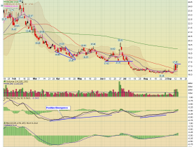 Chart 3 hourly: Gap bei 34.50 geschlossen gestern und danach Ausbruch aus Abwärtstrend. Weiteres Gap bei 33.75 wäre noch offen...