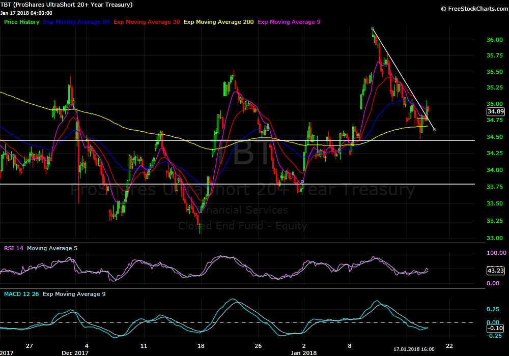 Gestern und vorgestern bin ich eine längerfristige Wette auf Zinserhöhungen (Bonds short!!) in den USA eingegangen. Grundsätzlich bin ich nicht so zufrieden mit meinem gewählten Instrument (TBT), da dies eine künstlich angefertigter ETF ist. Ich habe trotzdem gekauft.