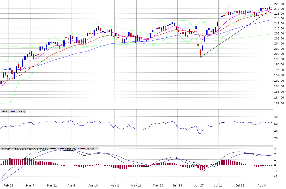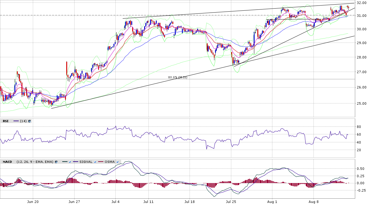 Für mich sieht das eher bärisch aus. Das lange Seitwärtsrumgeturne könnte auch eine Bodenbildung sein, ich sehe aber grössere Chancen für eine Auflösung nach unten. Hier spielt der 20 EMA eine gute Rolle. Jener ist nun ein deutlicher Widerstand. Im Mai konnte jener 20 EMA kurz überwunden werden, allerdings nur für einen Tag. Der 20 EMA ist aktuell knapp über 1.13.