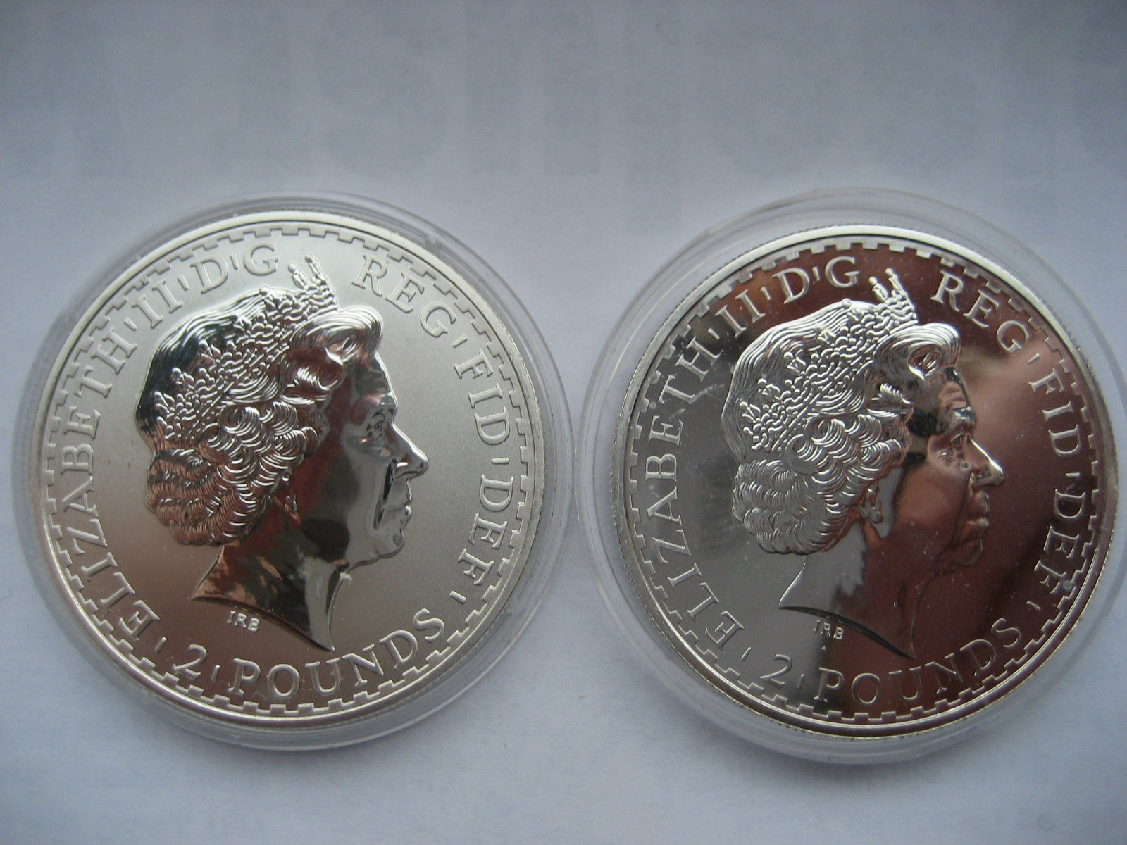 hatte mal einige ältere Britannias auf dem Flohmarkt gekauft, die ich jetzt verkaufen wollte. Beim fotografieren stellte ich fest , daß einige aussehen wie Proof Münzen: stark spiegelnd und empfindlich wirkend, ganz anders als die normalen Stempelglanz Britannias, die ja matt sind. Beim nachgoogeln kam für mich raus, daß die Proofausgaben ziemlich selten und das Motiv eigentlich matt sein müsste!? Das passt nicht wirklich auf meine Münzen, deswegen habe ich mal Vergleichsfotos gemacht, "Proof" vs Stempelglanz (leider verschiedene Jahrgänge) und möchte euch um eine Einschätzung bitten.
