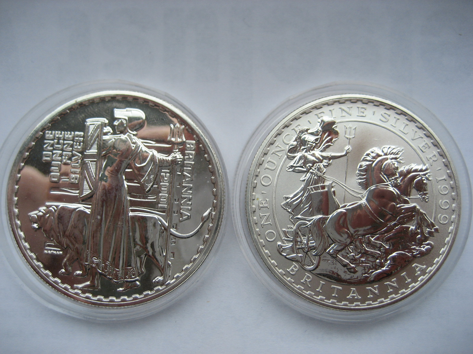 hatte mal einige ältere Britannias auf dem Flohmarkt gekauft, die ich jetzt verkaufen wollte. Beim fotografieren stellte ich fest , daß einige aussehen wie Proof Münzen: stark spiegelnd und empfindlich wirkend, ganz anders als die normalen Stempelglanz Britannias, die ja matt sind. Beim nachgoogeln kam für mich raus, daß die Proofausgaben ziemlich selten und das Motiv eigentlich matt sein müsste!? Das passt nicht wirklich auf meine Münzen, deswegen habe ich mal Vergleichsfotos gemacht, "Proof" vs Stempelglanz (leider verschiedene Jahrgänge) und möchte euch um eine Einschätzung bitten.
