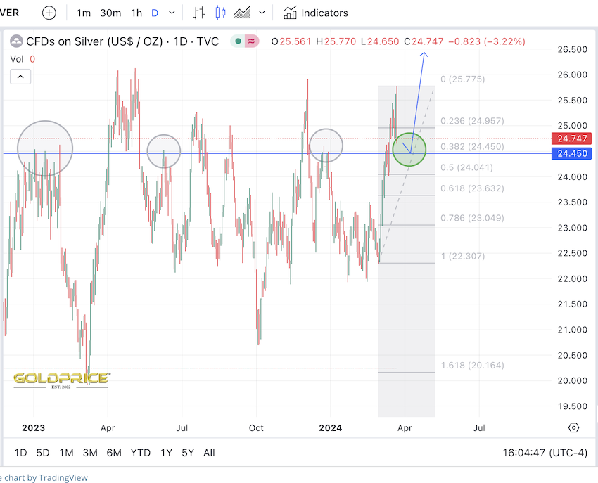 Bleibt zu hoffen, daß beim 38,2er Fibo (24,45 $) die waagerechte Linie hält und von diesem Basislager aus endlich der arbeitsreiche Anstieg durch die Bären-Marken-Zone um 26 $ herum gelingt...