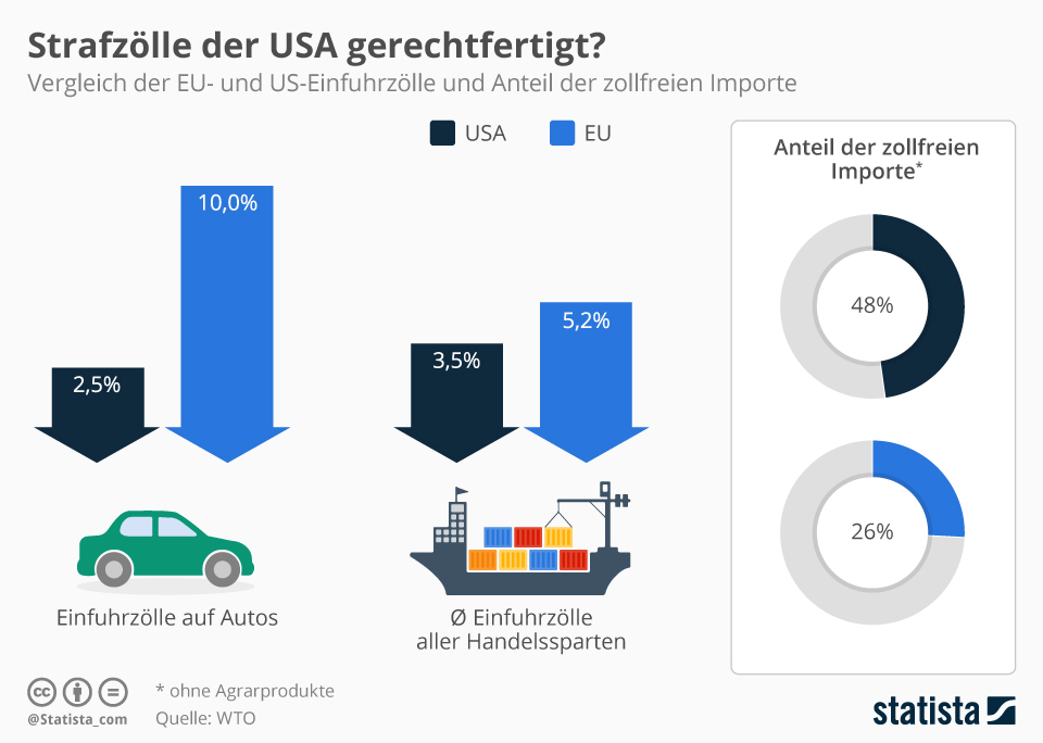 Infografik: Strafzölle der USA gerechtfertigt?Die Grafik zeigt einen Vergleich der EU- und US-Einfuhrzölle und den Anteil der zollfreien Importe von EU und USA.de.statista.com -
