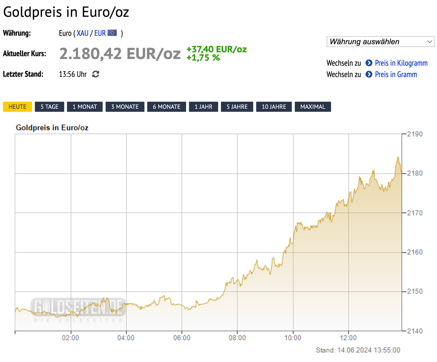 Schöner Anstieg heute. Und gleichzeitig gibts aktuelle keine Ware unter Spot. Zeigt, dass die Händler wieder gut verkauft haben und genügend FIAT haben. Das war vor einigen Wochen ganz anders, als man im Aufgeldrechner von gold.de noch ne ganze Reihe von Münzen hatte, die teilweise fast 1% unter Spot waren.