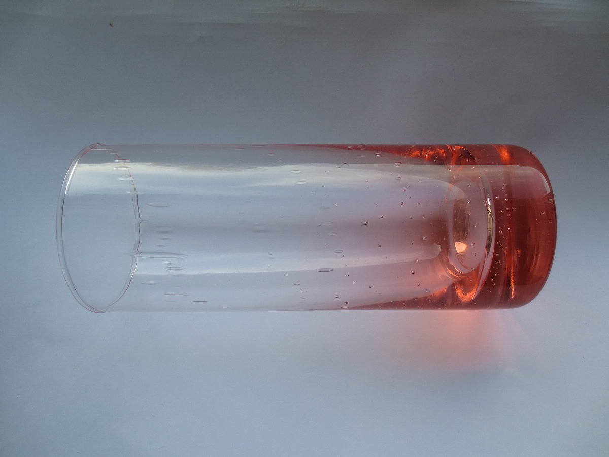 Nachdem das Objekt geschliffen und auf Hochglanz poliert wurde, weist es zahlreiche Mikrorisse auf, weswegen es das Licht nicht so gut durchlässt und weniger klar ist, als Glas aus der Hütte. Also muss das Objekt erneut in den Ofen um ganz leicht zum Glühen gebracht zu werden. Diesesmal darf es aber nicht so weich werden, dass es sich verformt. Das ist dann der "Klarbrand" oder materialtechnisch gesehen: das "Anlassen". Anders, als beim Stahl, bei dem beim Anlassen nur ein Teil der Gefügestörungen verloren gehen (damit genug Härte und damit dauerhafte Schärfe beim Gebrauch bleibt, es aber nicht bricht), gehen beim Glas alle Gefügestörungen verloren. Das Glas ist, wenn man das so sehen will, "naturhart". Wenn man es richtig macht, bleiben die Oberflächen des Glasobjektes sauber und es wird hochklar. Seihe Fotos auf Papier mit rotem Schatten bzw. grünem Hintergrund.