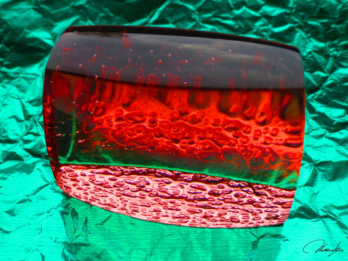 Da wir hier in einem Goldforum sind, habe ich Bilder eines Objektes aus Goldrubinglas genommen, bei dem noch ein weiterer Effekt dazukommt: