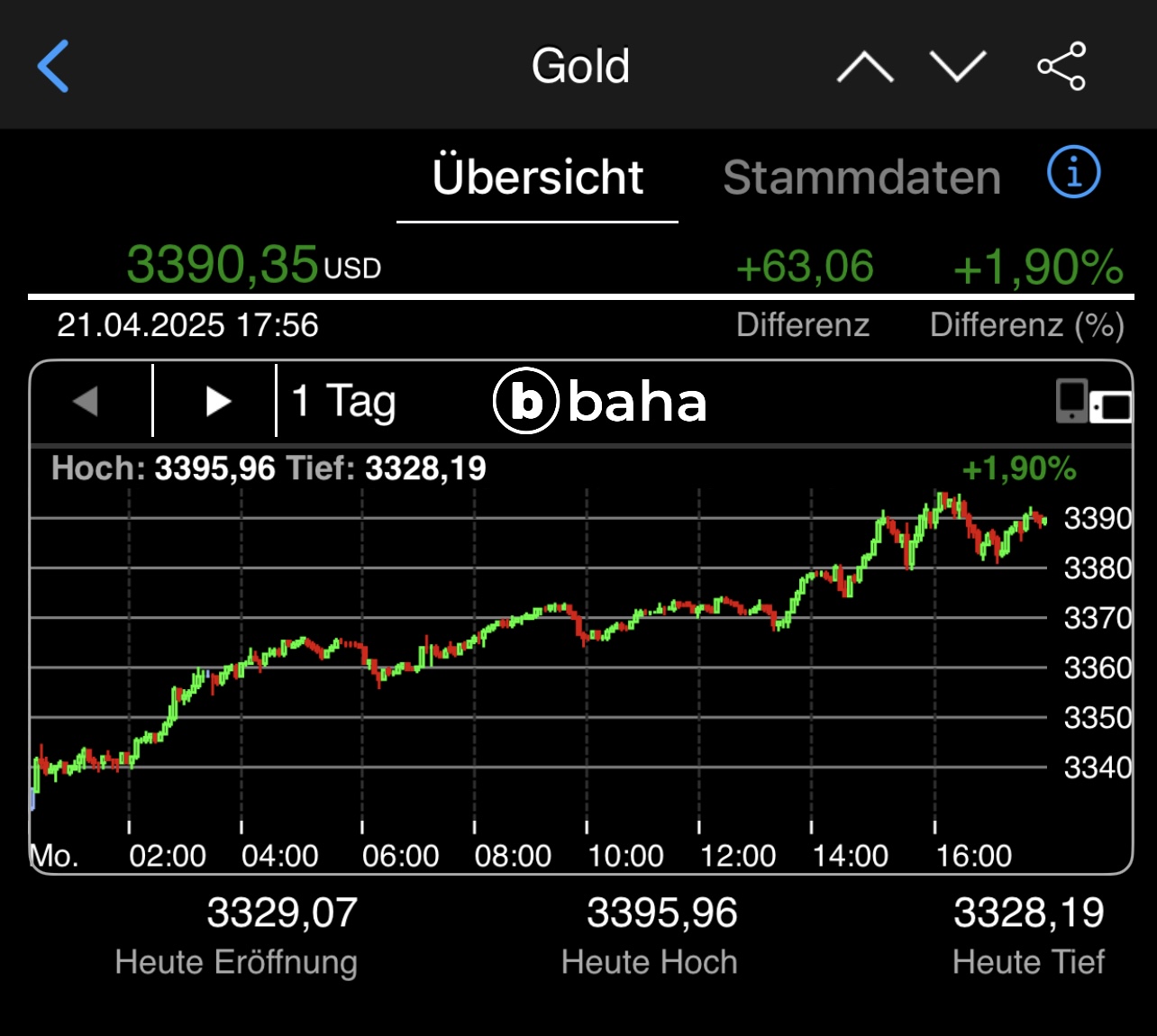 Gold in $ 3419,96 (+92,94) und in € 2968,90 (+54,82) um 21:48 Uhr ![]()