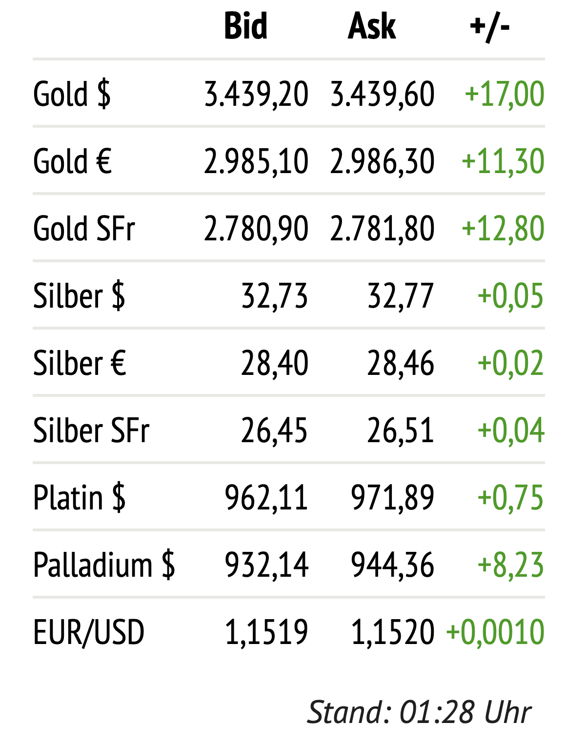 Wenn ich das richtig sehe, ist dies der richtige Kassakurs. Wir haben die 3.400 Dollar noch nicht geknackt und nach Abzug des Euroanstiegs um derzeit 1,0 Prozent bleibt uns noch ein moderates Plus in Euro von rd. 0,9 Prozent. Die deutlich höheren Notierungen bei Kitko oder Finanzen 100